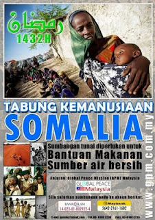 Ok,jujur kata aku terniat menulis gara-gara sahabat baik ku dengan artikel baru beliau di blognya.Menarik topik yang dipetik beliau,perihal 'Somalia'.Somalia sekarang sedang dilanda kemarau.Kebuluran,terputusnya bekalan air mentah dan bekalan makanan serta wabak penyakit merupakan pekara sinonim.Bersyukurlah sedang kita enak berbuka mereka masih berpuasa.